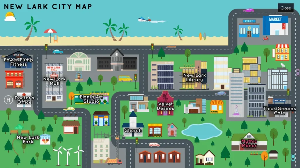 Knowing where to go is half the battle in how to play Mythic Manor. The manor and its surrounding town are accessed through a map screen. Early on, only a few spots will be available, but more will unlock as you progress. Each location is a stage for specific activities and events.